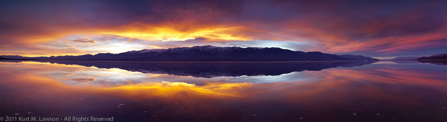 This was, I think, the most beautiful and intense sunset I have ever seen in no small part because I was seeing double! The color was amazing! I could not have asked for better conditions of clouds and a complete lack of wind (and thus lack of ripples.) It was a challenge to master the art of taking panos without moving one’s legs at all (because the ripples last about 5 minutes before they are gone from view!) I have made only exposure and contrast adjustments to the original 7 images to better reflect what I saw when I was there. The color is untouched from whatever Lightroom defaults to.
